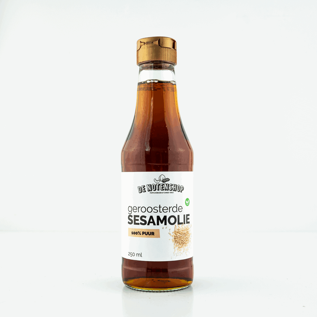 Sesamolie is een aromatische olie met een nootachtige smaak, ideaal voor Aziatische gerechten. Vaak gebruikt als finishing touch of lichte bakolie.