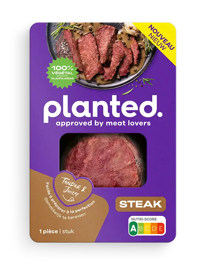 Planted Steak heeft een stevige, vezelige structuur die lijkt op rundvlees, maar is helemaal plantaardig. Perfect om te grillen of te bakken en serveer je met groenten, aardappels of op een broodje. Eiwitrijk en verrassend realistisch qua bite.
